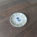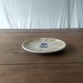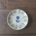 轆轤で制作したタンポポモチーフの皿です。サークル状にタンポポの絵が描いてあります。下地は白化粧土を筆塗りして地色とのムラ塗りでアンティークな雰囲気になってます。お気に入りのスイーツで楽しんで頂けたらと思います。土は粗目の土を使用してます。