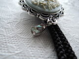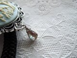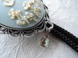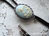 アクリルカメオ(ハミングバード/ハチドリ:/レジン/カラー:ウエッジウッドブルー×アイボリー/サイズ:約40×30㎜)、フレーム(フレーム付きワンカンセッティング/銀古美カラー:アンティークシルバー)、ループタイ用金具(ストッパー付き/カラー:シルバー)、剣先(シルバー)、サフィリーン(アンティークサフィレット/ヴィンテージガラス/ドロップ:スムースタイプ:約10×6㎜)、セッティング(しずく型/真鍮シルバーカラー/10×6㎜用)、丸カン(SUS316Lサージカルステンレス/高品質日本製)組み紐(高品質/東レシルック/100cmまで同価格)、超強力接着剤(アクセサリー専用及びUVLEDライト接着剤の2種類で固定)、ジェムストーンエッセンス(Heaven&Earth社製:エネルギー強化剤)