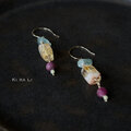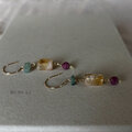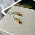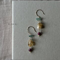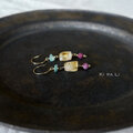 水分を閉じ込めたガラスのようなシトリンを主役に、カイヤナイト、ルビー、ジェイドを組み合わせてサマーリゾートに似合いそうなピアス(イヤリング)に仕立ててみました。