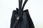 コッパーリベットやレザー使いが無骨なデザインの巾着バッグ。