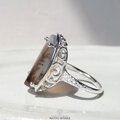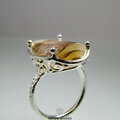 植物を閉じ込めたような独特の表情を持つアゲートを、唐草と透かし模様の台座にセットしたリング。