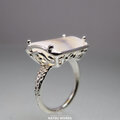 植物を閉じ込めたような独特の表情を持つアゲートを、唐草と透かし模様の台座にセットしたリング。