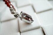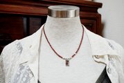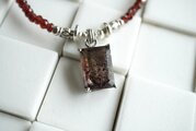ネックレスに使用した直径2.5mm程度のボタンカット型ガーネットは、深く落ち着いた赤色がとても美しい石です。トップの石ともよく調和して、全体で美しい景色を見せてくれているかと思います。大人の女性にぴったりなネックレスだと感じていただけるのではないでしょうか。