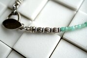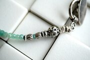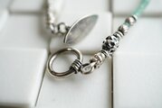留め金はシルバーのわっかマンテルですが、わっかに通すバーの部分が葉っぱのような形をしています。留め金のわっか隣に小さなお花モチーフのシルバービーズを配していますので、ちょうどいいかしらと思ってこの留め金を選びました。