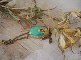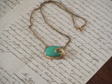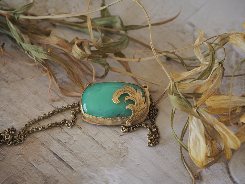 カルセドニーの中でも最も希少で価値があるものが、クリソプレーズです。この美しい、とろみのある緑色の石にすっかり魅せられた私は、新緑の季節の始まりを待って、クリソプレーズのネックレスをデビューさせようと決めていました。大好きなアカンサスの葉をモチーフにして、ワクワクしながら制作しました。緑色の石は肌の色を美しく見せてくれる魔法の石です。