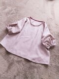 くすみピンクリネン&コットンレースのパフスリーブブラウス