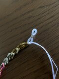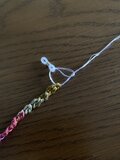 糸の輪の中に、糸端をくぐらせて引っ張り、ゴム金具とグラスコードをつなげます。(写真7~10)