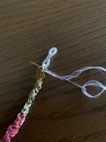 さらに針を使って、糸をグラスコードの輪の根元の部分のレース糸の編み目、レース糸3本ぐらいにくぐらせてください。(写真19)