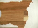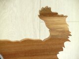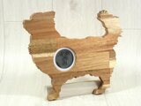 意匠をチワワ(ロングコート)のシルエットのみとして、材のアカシア集成材の木目と木組みのモザイク模様を活かしてインテリアとして飽きのこない作りとしています。