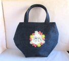 デニム生地を使ったコロンとした形の手提げバッグです。