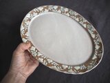 縁には釉薬で花の模様を描き、本焼き後に上絵の具で加飾しています。縁の内側はフラットな形です。