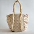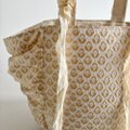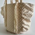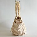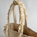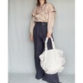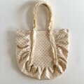 マチにはたっぷりと生地を使ったギャザーが特徴的で、持ち手にはアクセントで手染めされたリボンにたっぷりのギャザーを寄せてセットしました。