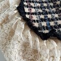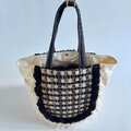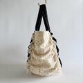 マチにはたっぷりと生地を使ったギャザーが特徴的で、ヴィンテージレースを使用しています。荷物もたっぷりと入れられる大きさも魅力の一つです。肩に掛けられるくらいの長さの持ち手なのでとても使い勝手の良いアイテムとなっております。
