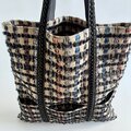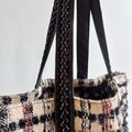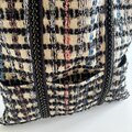 ピンクやブルー、シルバーの糸を織り込んで作られた生地は美しく高級感があります。ベージュベースに黒のモール糸も存在感があり、派手な糸を使用しているにも関わらず洗練されて落ち着いた印象のバッグです。