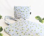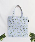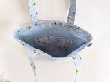 サックスブルー色(くすみブルー色)綿オックス生地に可愛いスズランの花柄、マチなしマジックホックなしのペタンコなトートバックです。
