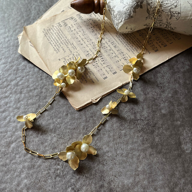 ランダムな密集感がすてきな、ひらひらフラワーのネックレス。