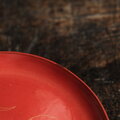 濃い朱色系の赤に沈金による可憐な花と月の絵付けがとても愛くるしい中皿になります。