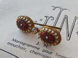 アンティーク 小さな 朱赤/文様/白のドット エナメルブローチ