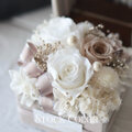 ホワイトとグレージュでまとめた上品な色合いと、ふんわり咲いたローズや紫陽花、プリザーブドフラワーの繊細さとパールの入ったアレンジは、まるで本物のジュエリーのような美しさ♪