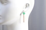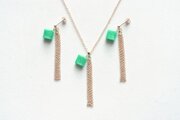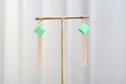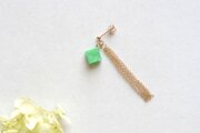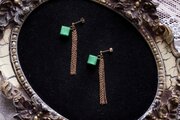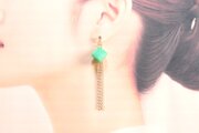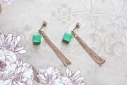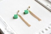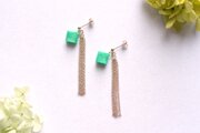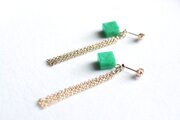 光沢のあるエメラルドグリーンのキューブとゴールドのフリンジが耳元で揺れる様子が可憐なピアス。