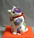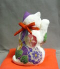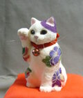 軽量粘土で形成した招き猫に白の古風江戸縮緬を貼り模様部分にはふじ紫を基調にしたきれいな柄の縮緬を貼りました。