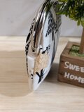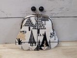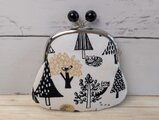 ちょっと大人っぽいモノトーンな森の中から顔をのぞかせる猫ちゃんが可愛いがま口ポーチです。