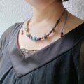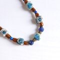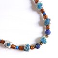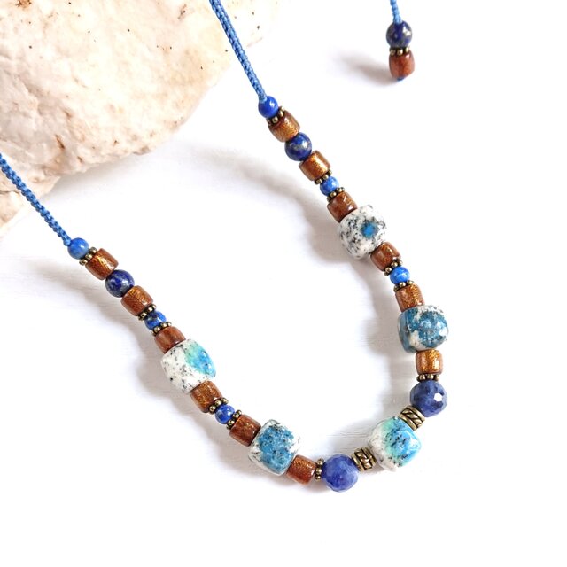 K2ブルーと呼ばれるヒマラヤ産のアズライトとゴールデンコーラル、それにブルーの天然石を組み合わせた、渋めな配色のネックレスです。