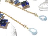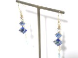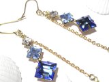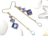 ヴィンテージの、クリアストーン、透き通った水色のストーン、透き通った鮮やかなブルーカラーストーンとでサイズがグラデーションになったダイヤ型グラスストーンと、透明度の高いしずく型のブルージルコンを組み合わせたフックピアス。