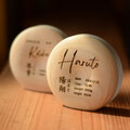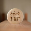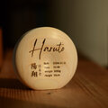 お祝い用にいかがでしょうか。木工ろくろでなだらかな曲面を作りレーザーで印字します。市販されているものはフラットな板に印字しているケースが多いため、この品物はシンプルでありながらも意外に珍しいフォルムだと思います。出産のお祝いやひなまつりや端午の節句などにお飾りください。