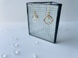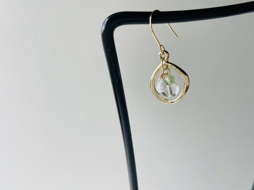 ペールグリーンの小さなガラスが良いアクセントになっており、お顔周りが明るい印象になるすてきなピアスです♪