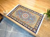 ペルシャ絨毯クム産シルク サラヤン工房 玄関マット 92x60㎝ ブルー ネイビー NT13832 【A5】