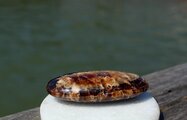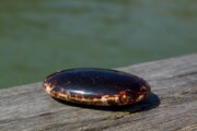 非常に艶があり、美しい色合いの、プチーノカルサイトのパームストーンです。