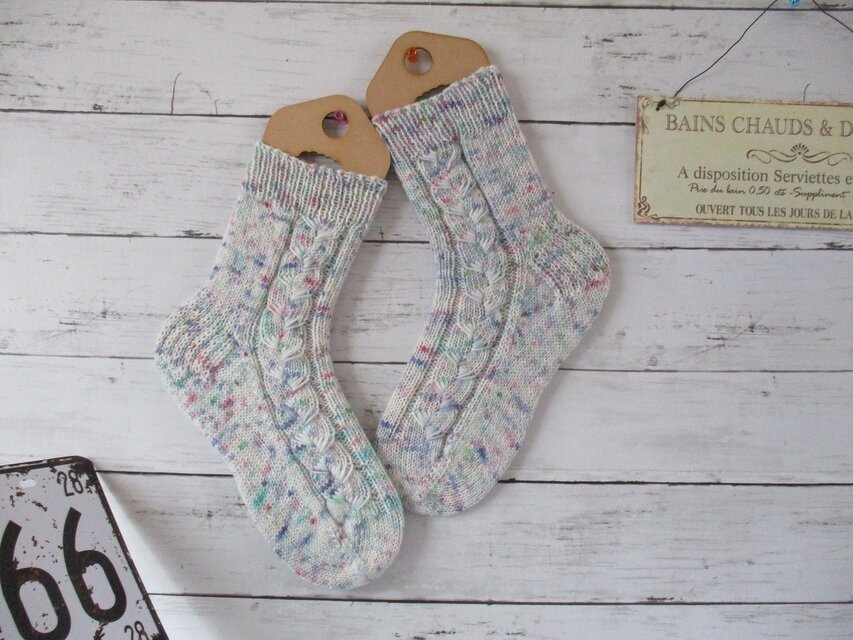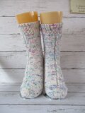 毛糸の特性上、左右で柄が違い靴下の両サイドに模様を編みました。