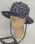 長い紐をクルクル頭周りに結んで風に飛ばされないようにかぶって、