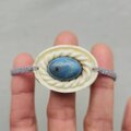中央に埋め込んだトロレアイトは、石模様が自然の造形であり、深く澄んだ青の中に、グレーがかった雲のような模様がゆるやかに浮かび、表面には石英由来のガラス光沢がうっすらと光ります。