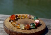 中心にオーバルのアンバー、8ミリのタイガーズアイ、10ミリのシトリン、12ミリのルチルクォーツ、12ミリのグリーンファントムクォーツ、10ミリのインペリアルとパーズ、最後に12ミリのシナバーを組ませました。