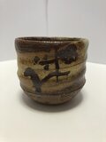 圧倒的な貫禄を放つ陶器製ぐい呑み、アースカラーの中の梅の花も古風なデザイン。50ml程度飲みきりもOK