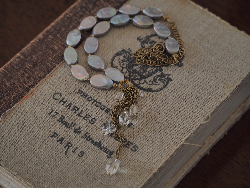 何日かして、今まで使おうと思わなかったフラットなパールでネックレスを作り始めました。するすると出来上がったその作品を見ると、まるであの夜の月光のようではありませんか。そして中央できらりと光るクリスタルはまるで月の女神アルテミスの涙のよう・・・。その涙は自然を破壊し、生命の循環を大切にしていない現代の私たちへの怒りと悲しみでしょうか。それとも、それとも・・・。