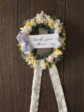 ヒムロスギをベースに、白いアジサイやイモーテル、黄色のスターフラワーやアマレリーフラワーなどをアレンジしたオーバル形のミニリース。