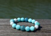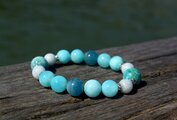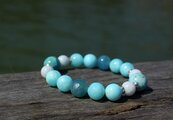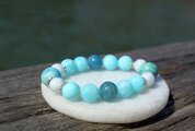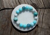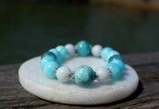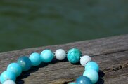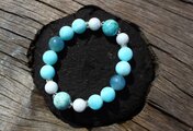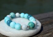 中心に14ミリのナチュラルなヘミモルファイト、10ミリのセレスタイト、12ミリのAAA級ヘミモルファイトの間に13ミリのレムリアンアクアンティンカルサイト、10ミリのセレスタイト、最後に14ミリのヘミモルファイトを組ませました。