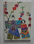 桃の花をバックに、お雛とめ雛の図柄を紅型の技法で染め、ファブリックパネルに仕立てました。
