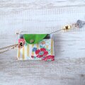 メインの生地はヴィンテージのフィードサック、黄色のストライプに赤と白の花柄です。