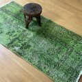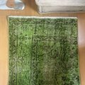 あまり見かけないレアカラー、優しいワサビのようなグリーンに染められた、オーバーダイのヴィンテージラグ。