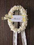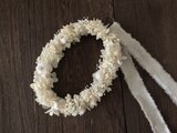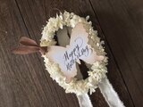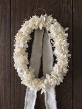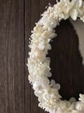 白いアジサイやスターフラワーブロッサム、イモーテルなどをアレンジしたオーバル形のプチサイズのリース。