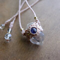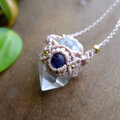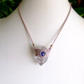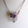 やや小ぶりですが透明感も高く内部のクラックも神秘的なブラジル産水晶原石と深いすみれ色の魅力的なアイオライトを組み合わせた個性あふれるマクラメ編みペンダントです。