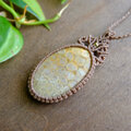 天然にできた菊の花びらのような独特の模様が神秘的なやや大きめのインドネシア産フォッシルコーラル(化石珊瑚)のマクラメ編みペンダントです。珊瑚の化石が長い年月をかけて石英化したフォッシルコーラル(化石珊瑚)のナチュラルな風合いがとても印象的です。