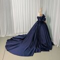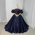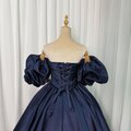 カラードレス ネイビー パフスリーブ 光沢サテン プリンセスライン 結婚式 編み上げ エレガント