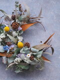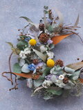 ドライフラワーなのですが、色彩に富んでいて、オレンジ色の木の実や、ブラウンのお花や松ぼっくりが、秋を感じさせてくれます。また、箱を開けた時の、ユーカリの葉のとても良い香りも、嬉しかったです。今回も、素敵なリース、ありがとうございました。