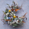 瀬戸内の森で育ったユーカリとグレビレアを 風が吹き抜けるように躍動的に紡ぎ、可愛らしい木の実と涼しげな色味の草花を添え、爽やかで軽やかな作品に仕立てました。