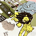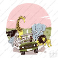 ねこのジャンと船乗りのピエールが、南アフリカ・ポートエリザベスのサファリツアーを楽しんでいるイラストの原画です。
